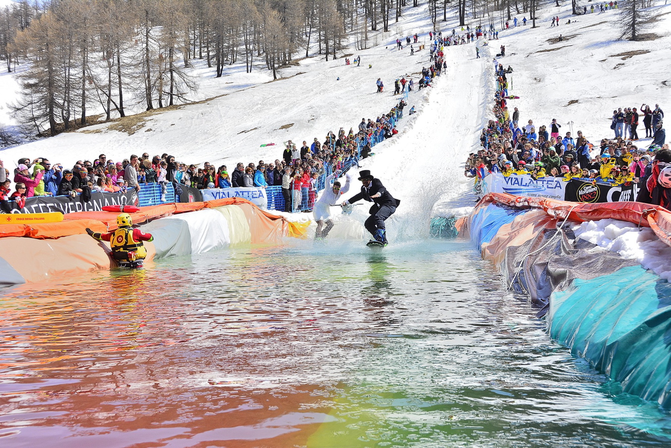 Sabato 8 aprile torna a Sestriere la “Fossa dei Matt”, la pazza festa “spring splash” di fine stagione giunta alla sua terza edizione. La sfida è quella classica: superare, dopo una discesa sulla neve, la piscina artificiale (lunga 28 metri larga 6) realizzata per l’occasione sulla pista Principi in zona Gargote Fashion Cafè.