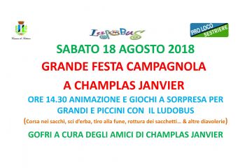Leggi tuttoSABATO 18 AGOSTO GRANDE FESTA CAMPAGNOLA A CHAMPLAS JANVIER