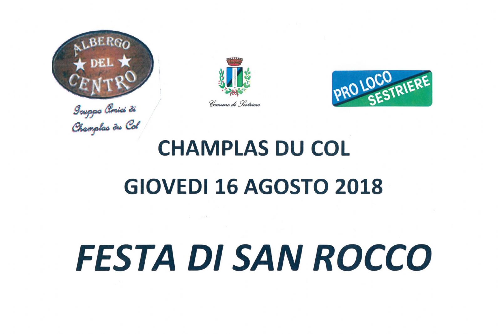 Giovedì 16 agosto a Champlas du Col, frazione di Sestriere, si terrà la Festa di San Rocco. Alle ore 11 verrà celebrata la Santa Messa con distribuzione di pane benedetto nella Cappella di San Rocco. A seguire "Aperitivo al pe' d'chanla'" offerto dalla Pro Loco Sestriere in collaborazione con l'Albergo Ristornate il Centro ed il Gruppo Amici di Champlas du Col. Giro turistico in frazione con il Trenino di Sestriere. Per tutto il giorno animazione per bambini a cura dello staff del Ludobus.