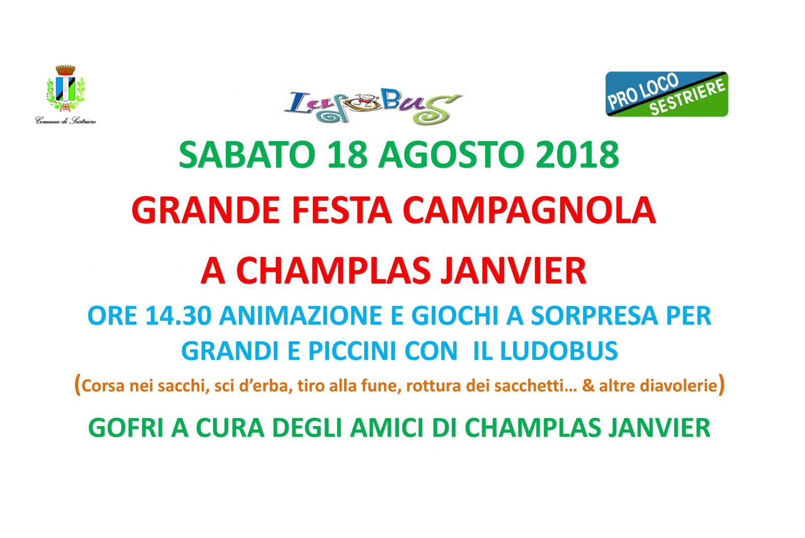 Torna sabato 18 agosto la Grande Festa Campagnola di Champlas Janvier, frazione di Sestriere. Dalle ore 14.30 animazione con lo staff del Ludobus e giochi a sorpresa per grandi e piccini. Corsa nei sacchi, sci d'erba, tiro alla fune, pentolaccia e altri giochi vi attendono. E poi meranda di gusto con i gofri a cura degli amici di Champlas Janvier.