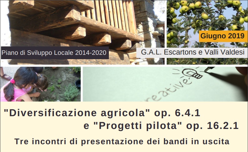 Il GAL Escartons e Valli Valdesi organizza tre incontri pubblici per presentare due bandi di imminente pubblicazione. Ogni incontro prevede un momento collettivo per dare informazioni generali e a seguire incontri dedicati per sottoporre al personale del GAL domande relative al proprio caso specifico, attraverso appuntamenti scaglionati, perché ognuno abbia uno spazio dedicato.