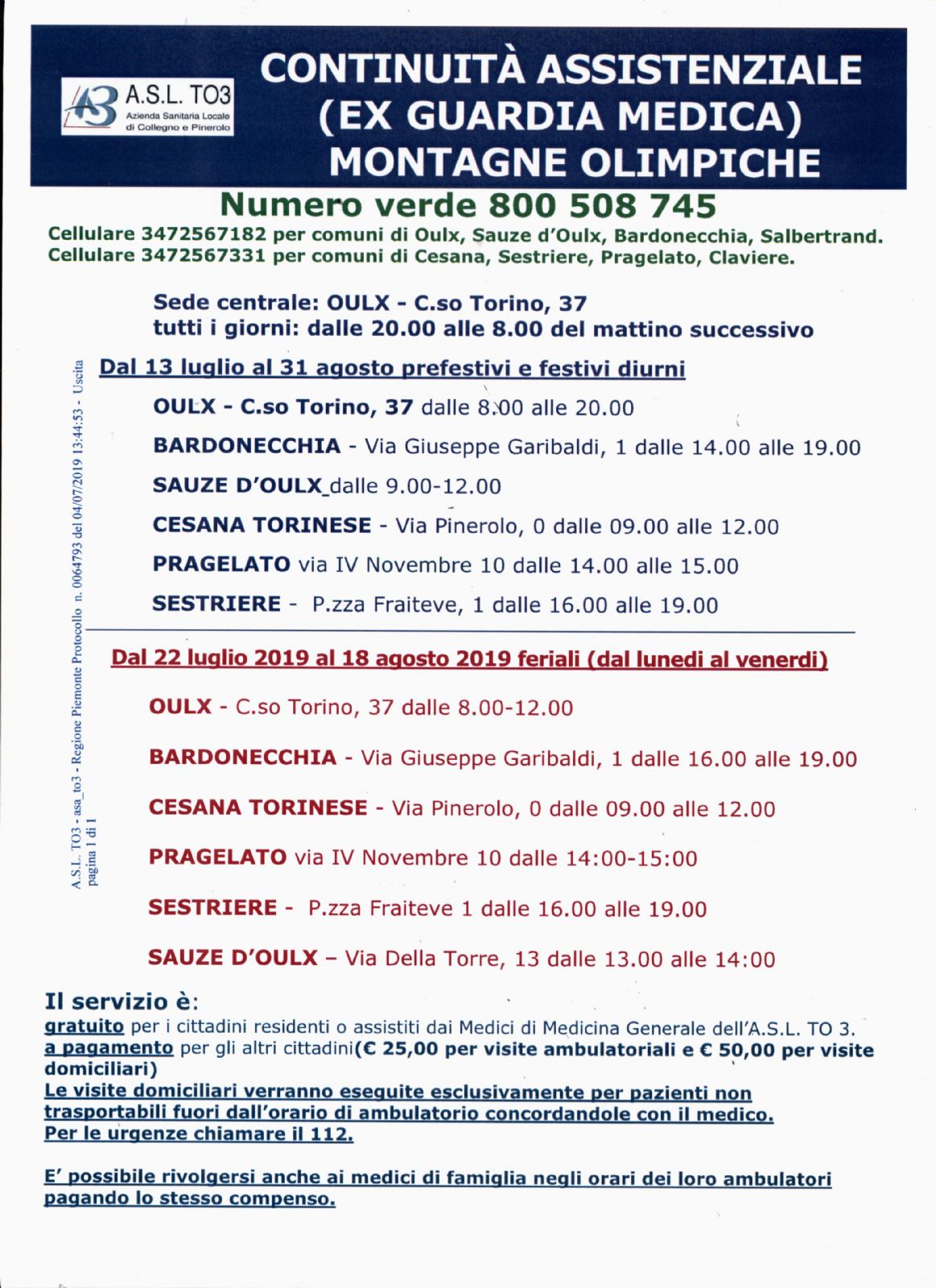 Si avvisa la popolazione che in ottemperanza del progetto di " Assistenza Turistica Montagne Olimpiche" dal 13/07/2019 al 31/08/2019 sarà operativo il potenziamento del Servizio di Continuità Assistenziale in Alta Valle Susa e Val Chisone.