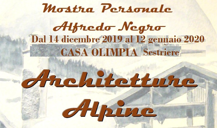 Dal 14 dicembre 2019 al 12 gennaio 2020 Casa Olimpia a Sestriere ospita la Mostra Personale di Alfredo Negro, Architetture Alpine. Inaugurazione sabato 14 dicembre 2019 ore 17,30. Natura ed architettura ecco i soggetti protagonisti di questa da Alfredo Negro. Un suggestivo percorso di immagini e scorci che rievocano ridenti e spensierati ricordi montani dell’artista.