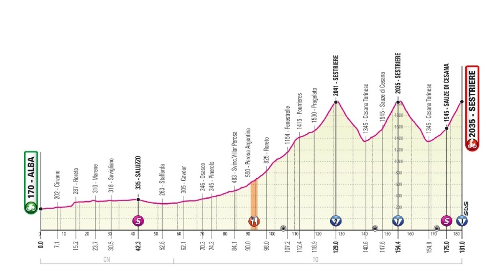 SESTRIERE – Il Giro d'Italia ridisegna in corsa la penultima, attesissima, tappa, la Alba-Sestriere in programma sabato 24 ottobre. Una decisione maturata dalla direzione della corsa a seguito del ritiro da parte delle autorità francesi delle autorizzazioni concesse per lo sconfinamento oltralpe per ragioni legate alla sicurezza sanitaria. Diventa così operativo il piano B previsto originariamente in caso di maltempo per questa versione della Alba-Sestriere di 181 km. Una tappa di alta montagna che per Sestriere si trasforma in una grande opportunità sportiva e mediatica data la triplice passerella. Già perché i corridori attraverseranno una prima volta Sestriere salendo dalla Val Chisone, poi scenderanno lungo la SR23 sino a Cesana Torinese e percorreranno la SP215 verso la Valle Argentera attraversando Sauze di Cesana e Grangesises per poi salire nuovamente a Sestriere ma questa volta dal versante dell’Alta Valle di Susa. Un percorso che ripeteranno due volte (pari a 50 Km) e che culminerà con il traguardo ai 2035 metri d’altitudine del Colle del Sestriere. Traguardo che deciderà la maglia rosa del Giro d’Italia 2020.