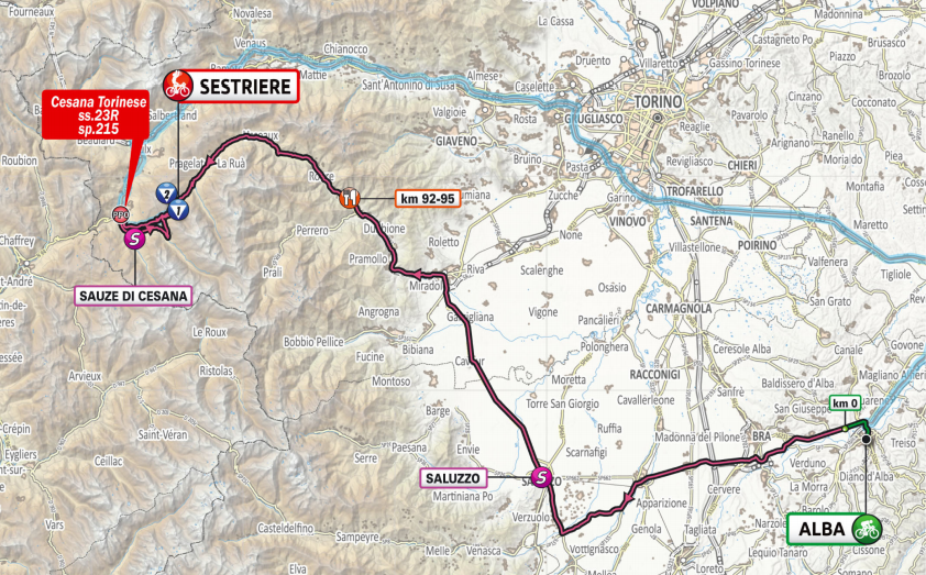 CHIUSURA STRADE SABATO 24 OTTOBRE PER 20° TAPPA GIRO D’ITALIA - Sul versante della Val Susa si raccomanda di organizzarsi per essere a Sestriere entro e non oltre le ore 12.00 in quanto alle 13.00 la SR 23 e la SP 215 (da e per Sestriere) resteranno chiuse al transito in entrambi i sensi di marcia sino al termine della gara previsto dopo le ore 17.30.