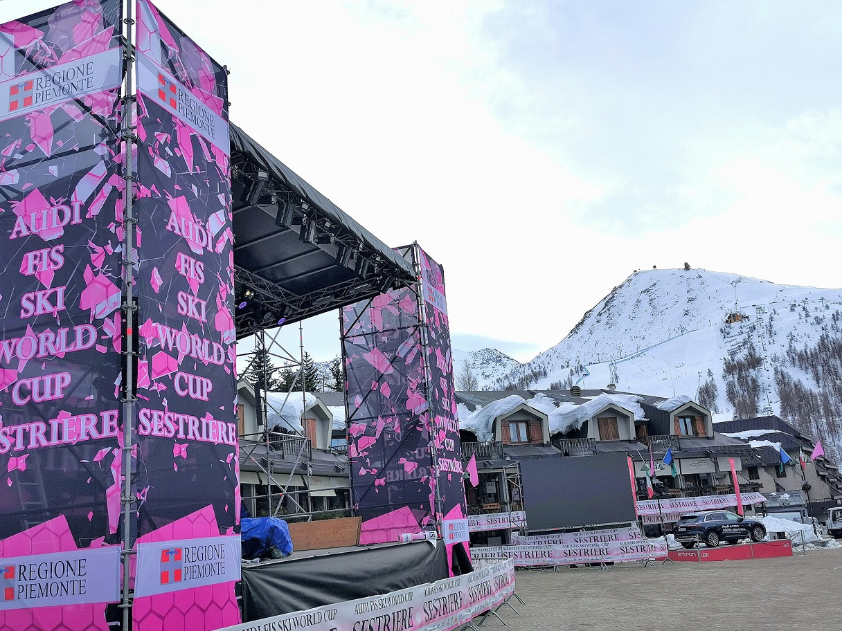 In centro a Sestriere il grande palco allestito in piazza Fraiteve è pronto ad accogliere la super festa dello sci che andrà in onda sabato pomeriggio con le premiazioni ufficiali del Gigante e la passerella delle atlete che si sfideranno domenica nel Parallelo.