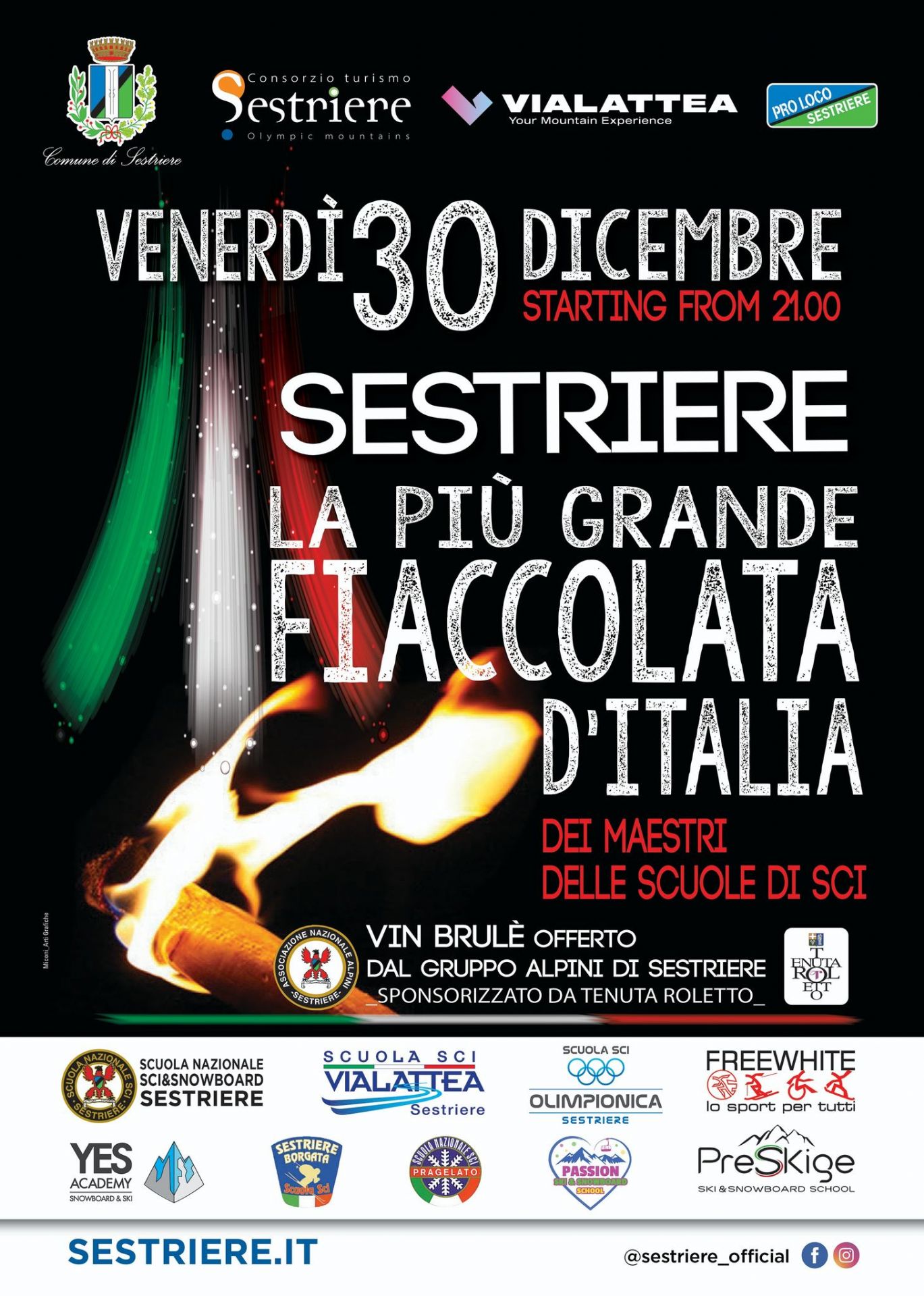 Dalle piste olimpiche del Colle, scenderà un gigantesco tricolore luminoso composto dalle fiaccole portate dai Maestri in rappresentanza di 9 Scuole di Sci e Snowboard di Sestriere e Pragelato. Al parterre di arrivo piste verrà offerto vin brulè dagli Alpini del Gruppo ANA di Sestriere.