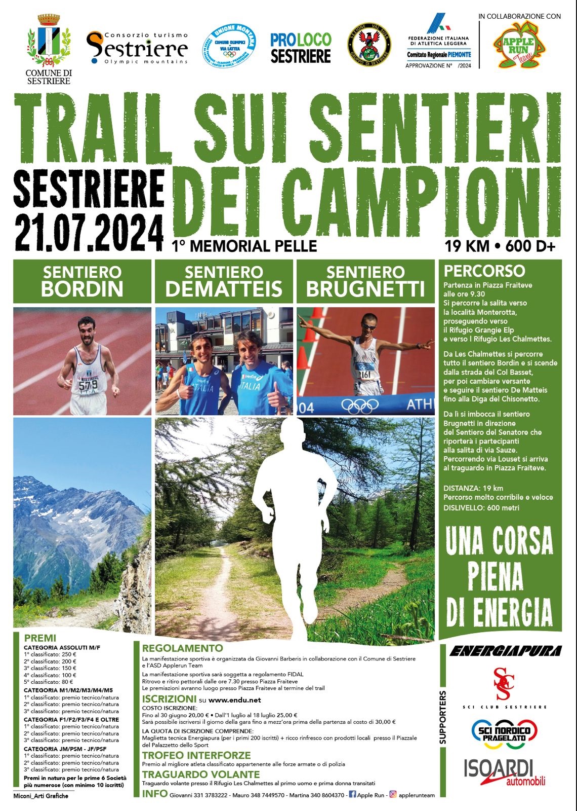 SESTRIERE – Cresce l’attesa per la prima edizione del Trail sui Sentieri dei Campioni a Sestriere, “1° Memorial Pelle”, in programma domenica 21 luglio 2024. Una corsa sulla distanza dei 19 km e 600mt D+ che toccherà i sentieri al Colle intitolati a grandi campioni che proprio a Sestriere preparavano gli appuntamenti più importanti, dai mondiali alle olimpiadi, coronati da una pioggia di medaglie d’oro. Stelle dello sport del calibro di Gelindo Bordin, di Ivano Brugnetti e Annarita Sidoti e dei fratelli Martin e Bernard Dematteis. Tra gli atleti che hanno già confermato la propria presenza in gara figura proprio Matrin Dematteis che guida la pattuglia dei top runner composta da Marco Moletto, Andrea Rostan, Luca Merli, Paolo Bert e tra le donne Carla Primo, Arianna Dentis e Gianfranca Attene. Atleti specialisti di corsa in montagna a cui se ne aggiungeranno altri… La partenza sarà alle ore 9.30 da Piazza Fraiteve che ospiterà anche il traguardo e le premiazioni finali dell’evento.