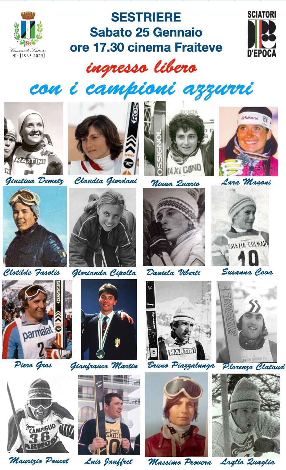Sabato 25 è in programma una sciata vintage, libera ed aperta a tutti, sulle piste della Vialattea: il ritrovo è alle ore 10.30 davanti alla Scuola Sci Sestriere. Nel pomeriggio, alle ore 17.30 al Cinema Fraiteve, con ingresso libero, si aprirà una finestra sulla storia di Sestriere con una parata di campioni Azzurri dello Sci e tanti ospiti ed amici che condivideranno con noi questa grande festa per i 90 anni del Comune di Sestriere. Diversi i campioni che hanno già confermato la loro presenza per l’incontro al Cinema Fraiteve. Tra questi segnaliamo Giustina Demetz, Claudia Giordani, Ninna Quario, Lara Magoni, Clotilde Fasolis, Glorinda Cipolla, Daniela Viberti, Piero Gros, Bruno Piazzalunga, Gianfranco Martin, Pierlorenzo Clataud, Maurizio Poncet, Massimo Provera, Gino Senigagliesi, Franco Arigoni e molti altri ancora...