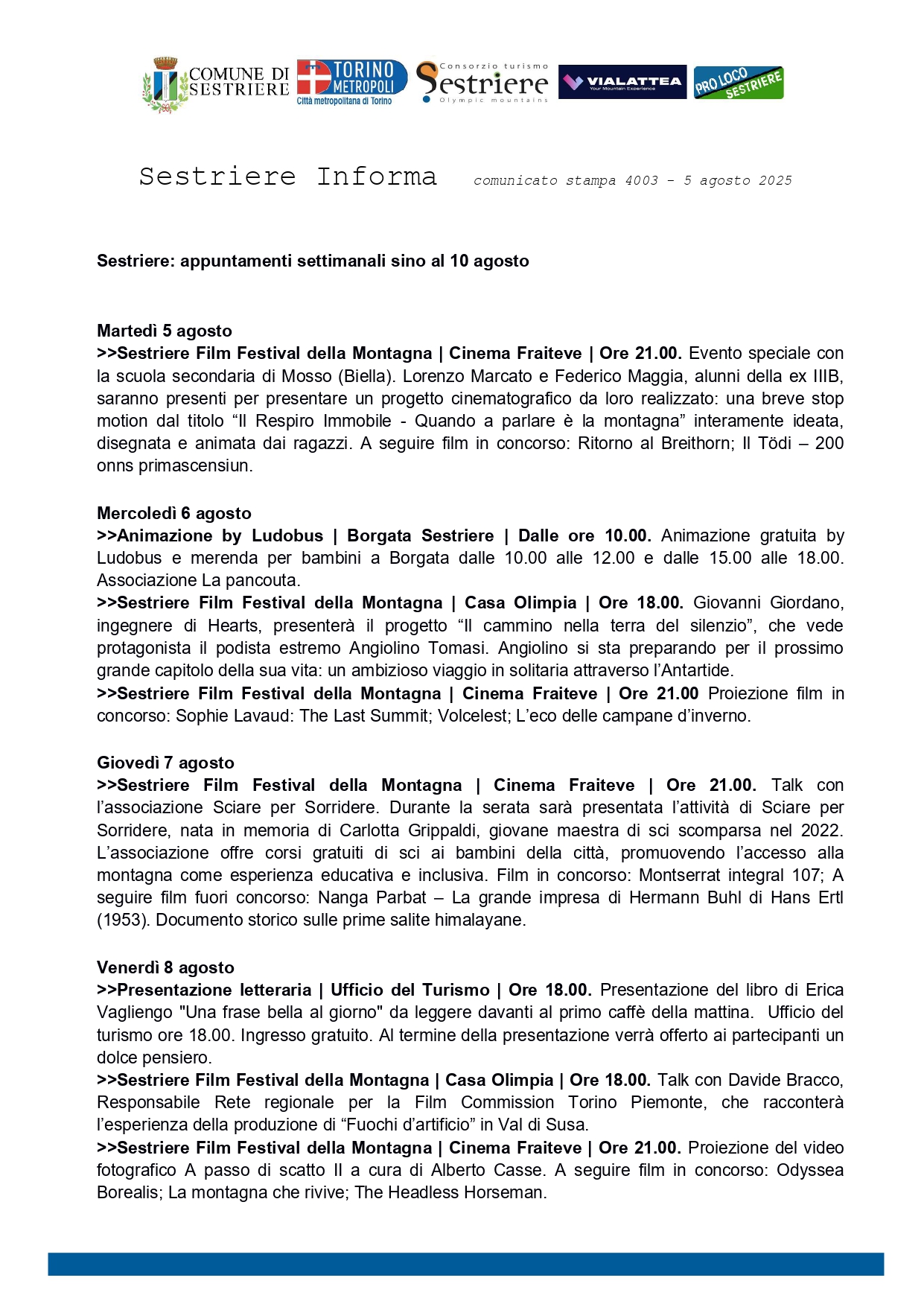 >>Sestriere Film Festival della Montagna| Cinema Fraiteve | Ore 21.00. Cerimonia di premiazione dei tre concorsi: Concorso cinematografico internazionale (15 film in selezione); Concorso fotografico (21 fotografie finaliste, con premio del pubblico). La novità di quest'anno: Premio letterario internazionale “Racconti di montagna – Sestriere Film Festival 2025” (96 racconti ricevuti in collaborazione con il Centro Studi Cultura e Società). A seguire film fuori concorso: Slalom (1965) di Luciano Salce, commedia cult girata a Sestriere.