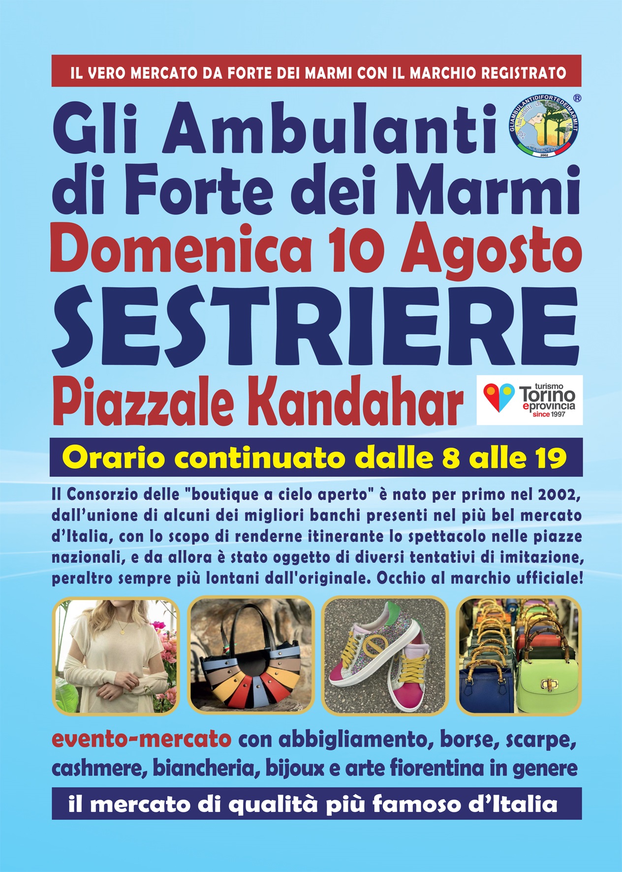 Gli Ambulanti di Forte dei Marmi, le bancarelle del mercato di qualità più famoso d’Italia, tornano per l’estate a Sestriere in piazzale Kandahar domenica 10 agosto con il loro show itinerante all’insegna del meglio del Made in Italy artigianale e delle ultime tendenze della moda. Un appuntamento da non perdere assolutamente per i tanti appassionati del genere: una rassegna dello shopping più glamour e conveniente, con orario continuato, anche in caso di maltempo, dalle 8 alle 19. Tutte le info on line sul sito www.gliambulantidifortedeimarmi.it, e sulla pagina Facebook.