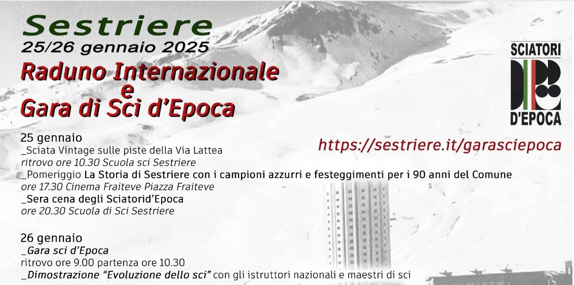 LA GARA DI SCI D’EPOCA – Il ritrovo è fissato alle ore 9.00 del 26 gennaio con partenza alle ore 10.30 sulla pista Standard del monte Alpette al Colle del Sestriere. Categorie: Antichi (M/F): Sci Legno con solette non plastificate, scarponi in cuoio; Anni 60 (M/F): Sci Legno plastica e metallo (costruiti fra il 60 e 70), scarponi in cuoio; Telemark pionieri (M/F): Sci Legno con solette non plastificate, scarponi in cuoio; Quelli della “Valanga”(M/F): Sci in plastica e metallo (costruiti tra il 70 e 80), scarponi in plastica; Vintage (M/F): Sci fino anni ’90 (dritti non sciancrati), scarponi in plastica; Telemark vintage (M/F).