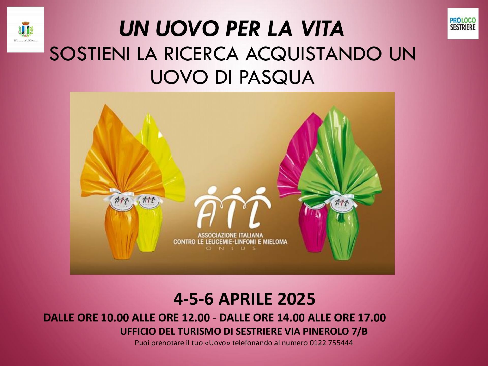 Prenota il tuo Uovo di Pasqua AIL all' Ufficio del Turismo di Sestriere. Puoi passare direttamente al desk oppure telefonare al numero 0122 755444 ed effettuare la prenotazione. Le Uova di Pasqua AIL saranno disponibili per il ritiro nelle giornate del 4 -5 e 6 aprile sempre all'ufficio del turismo di Sestriere.