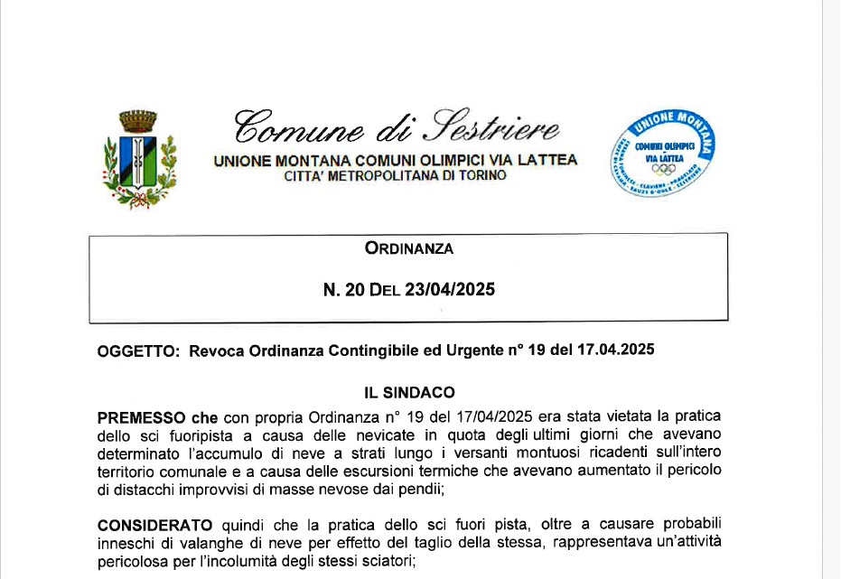 In data 23 aprile 2025, il Sindaco di Sestriere ha revocato l'ordinanza sindacale n°19 del 17/04/2025 in cui era stata vietata la pratica dello sci fuoripista a causa delle abbondanti nevicate in quota con conseguente accumulo di neve a strati sui crinali alpini del territorio comunale. In allegato copia dell'ordinanza di revoca n° 20 del 23/04/2025.