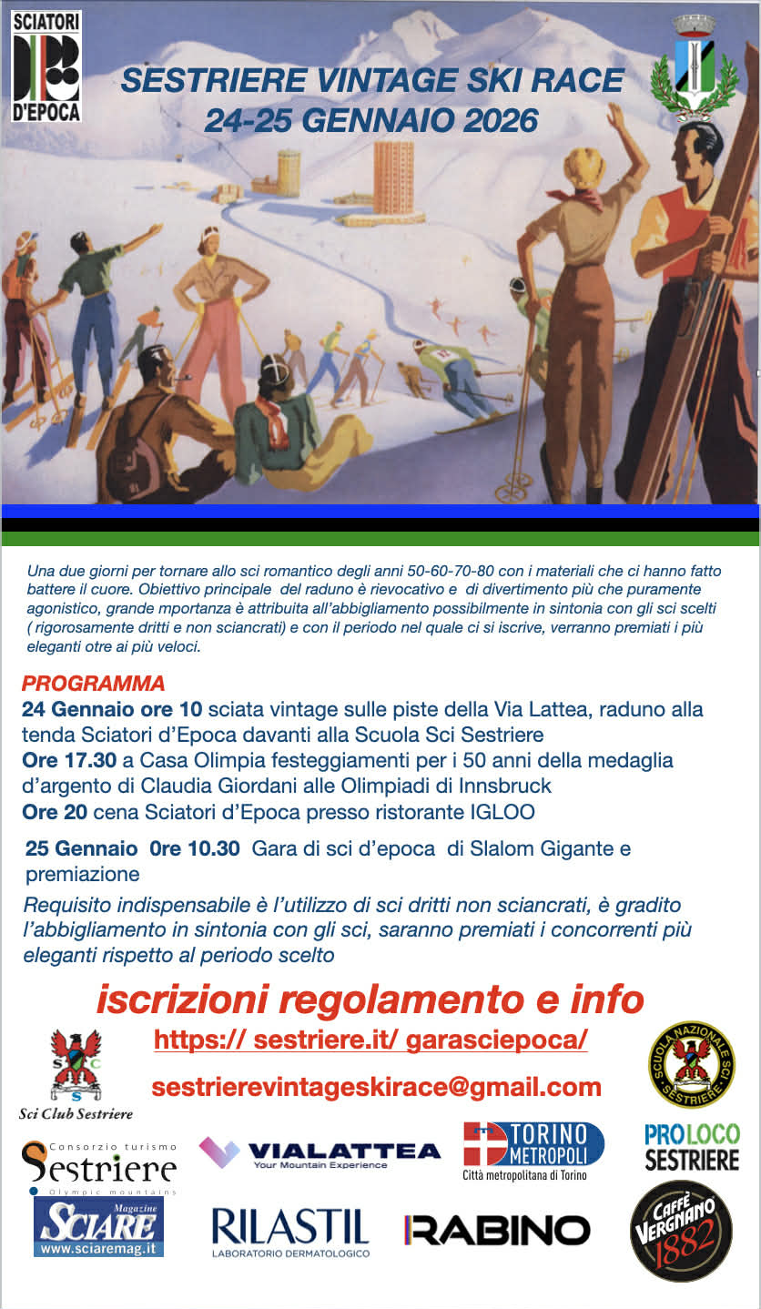 Domenica 25 gennaio i due giorni dedicati alla storia dello sci si concluderanno a Sestriere con una gara di Gigante con sci, scarponi e abbigliamento d’epoca, patrocinata dalla Città metropolitana di Torino.