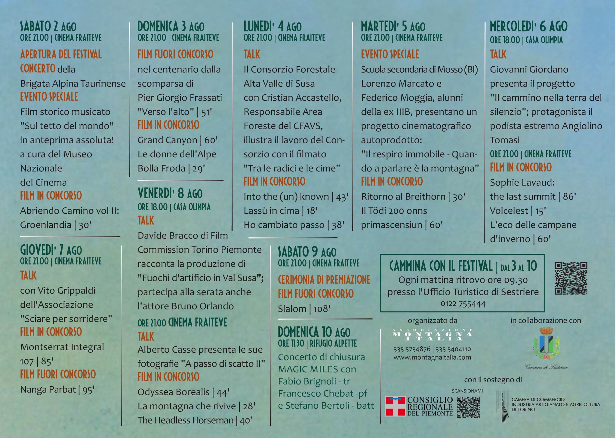 Il Festival, interamente dedicato alla cultura di montagna, promuove le terre alte attraverso il cinema, ma anche diversi eventi collaterali tra cui momenti di arte, musica, fotografia, premiazioni, escursioni.