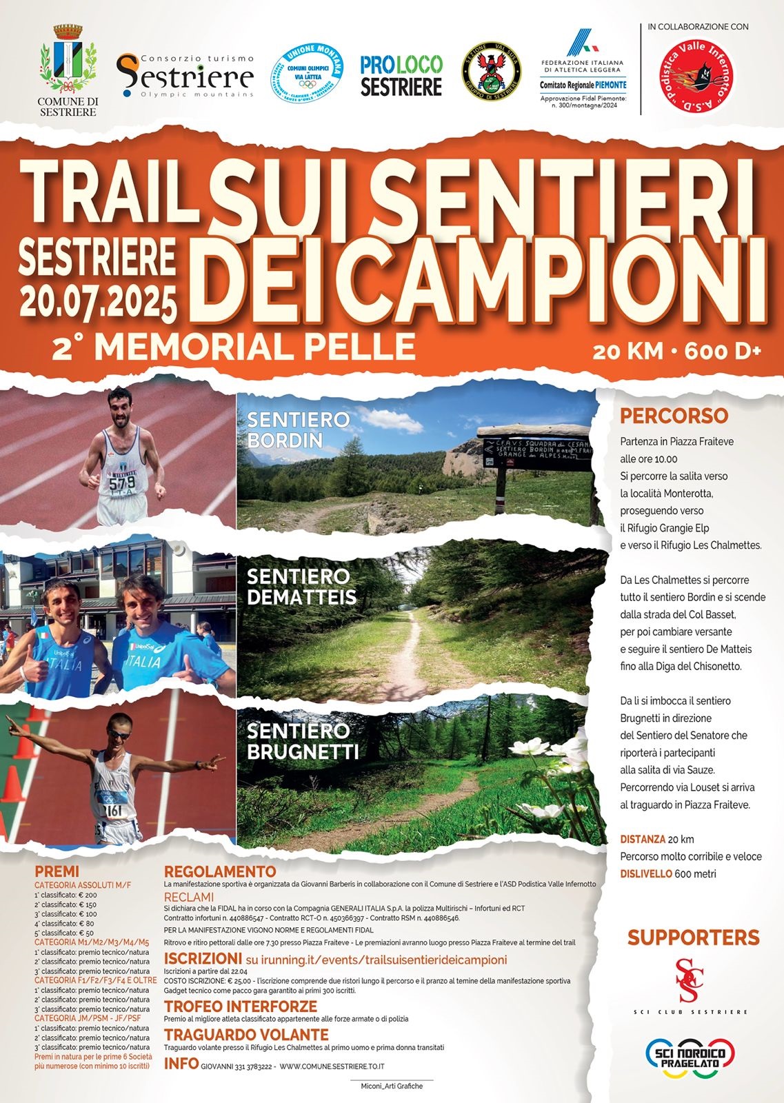 20 luglio: Trail sui Sentieri dei Campioni “2° Memorial Pelle” – Corsa in montagna sulla distanza di 20km per 600+ con partenza e arrivo al Colle del Sestriere da piazza Fraiteve e passaggi sui sentieri intitolati a Bordin, Dematteis e Brugnetti.