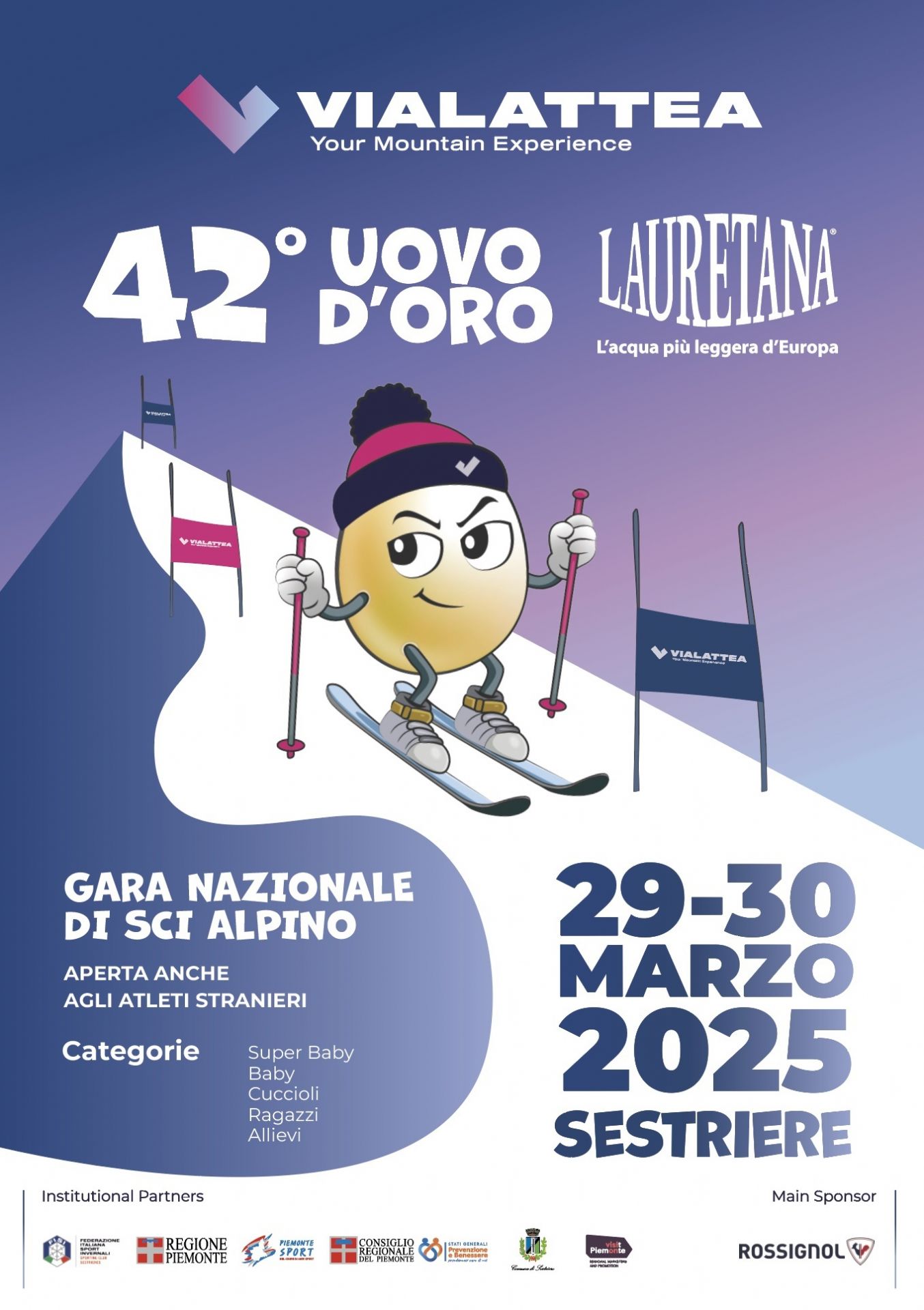 Il 43° Uovo d’Oro Lauretana, gara di Slalom Gigante inserita nel calendario nazionale FISI e aperta anche agli atleti stranieri, è organizzato dallo Sporting Club Sestrieres con il supporto del Comune di Sestriere. La manifestazione si svolge con il patrocinio della Regione Piemonte, del Consiglio Regionale del Piemonte e della Città Metropolitana di Torino, riconoscimento che ne sottolinea il valore sportivo e l’importanza strategica per il territorio piemontese.